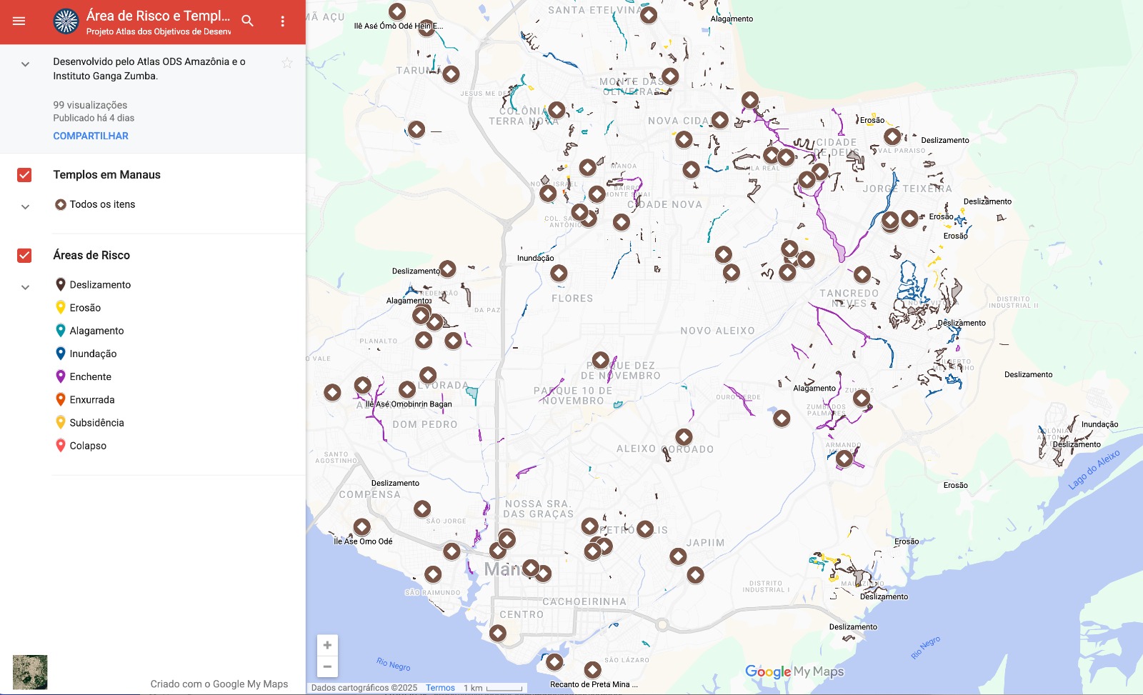A pesquisadora detalha que o atual mapeamento utilizado pelo projeto Cartografia da Resistência e do Cuidado é baseado nos dados públicos da CPRM 2025, que tornou “possível realizar essa associação entre as áreas de risco de Manaus e os templos, identificando localidades, como também o tipo de desastre ocorrido próximo a um templo específico.”