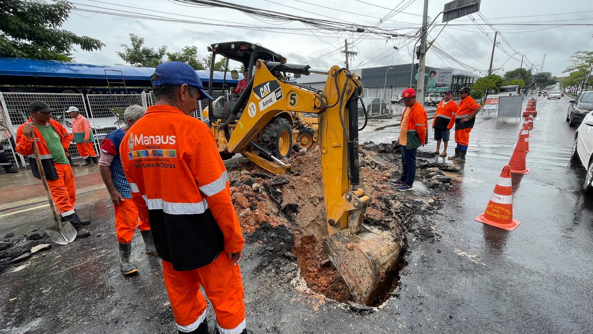 “A antiga rede drenagem que passa por aqui rompeu no tubo ármico, que tem mais de 25 anos. A orientação do prefeito David Almeida é que façamos uma nova linha de drenagem, com tecnologia de ponta, moderna e que proporcione segurança ao fluxo intenso da via. Para a execução da obra, precisaremos isolar a área. Estamos montando uma força-tarefa, avisando a população antecipadamente, para tentar dirimir os danos e os transtornos causados por essa intervenção”, explicou Renato Junior.
