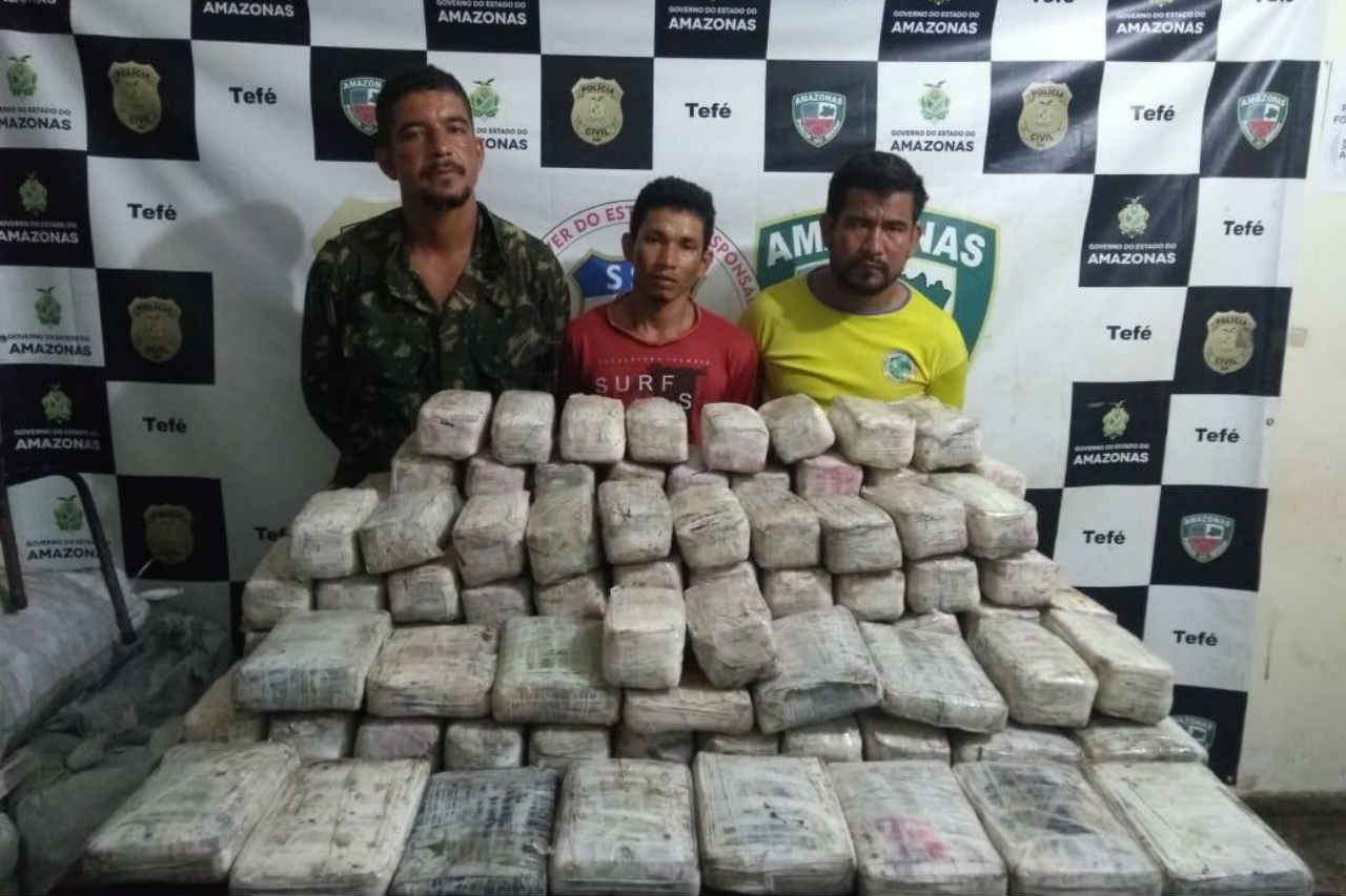 Policiais civis da Delegacia Interativa de Polícia (DIP) de Tefé, em ação conjunta com o Departamento de Investigação sobre Narcóticos (Denarc) da instituição, e policiais militares lotados naquele município, prenderam em flagrante, na tarde de terça-feira (17), por volta das 16h, André dos Santos Cavalcante, 27; José Diones Martins de Almeida, 35, e Pablo Lopes Pinto, 32. Com eles foram apreendidos 138 quilos de maconha do tipo skunk, em uma embarcação que trafegava pelo rio Solimões, nas proximidades do município (distante 523 quilômetros em linha reta da capital).