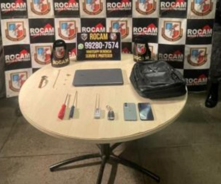 Durante a abordagem, nada de ilícito foi encontrado com os ocupantes na busca pessoal, mas na vistoria do carro foram achados pertences da vítima dentro de uma bolsa, além do dispositivo eletrônico conhecido como ‘Chapolin’.
