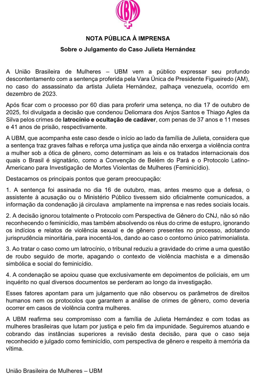 A União Brasileira de Mulheres (UBM) manifestou forte repúdio à decisão da Vara Única de Presidente Figueiredo que condenou os dois acusados pelo assassinato da artista e palhaça venezuelana Julieta Hernández apenas pelos crimes de latrocínio e ocultação de cadáver, sem o reconhecimento do feminicídio.