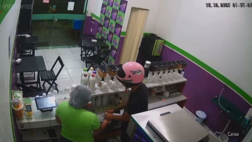 Dentro da loja de açaí só tinha uma funcionária que estava atrás do balcão. O assaltante foi até a mulher e colocou a mão na cintura como se estivesse usando um arma, mas não é possível confirma se ele estava mesmo armado.