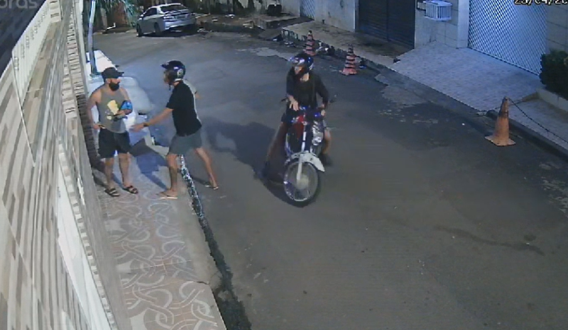 Por volta de 00h30, o homem estava caminhando pela rua quando os dois suspeitos surgiram na motocicleta. É possível perceber que a vítima leva um susto ao notar que se tratava de um assalto.