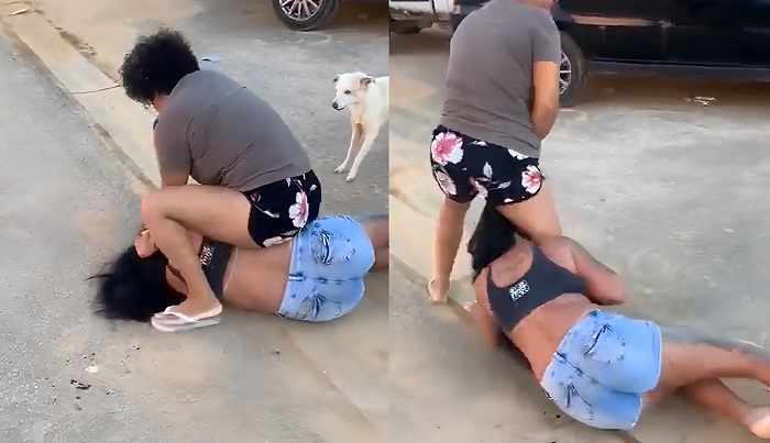 A amante apanha bastante no rosto, é arrastada pelo asfalto e depois a mulher a puxa, deixando os seios dela de fora. “Tu não gosta de mostrar teu peito pra macho casado?”, diz.