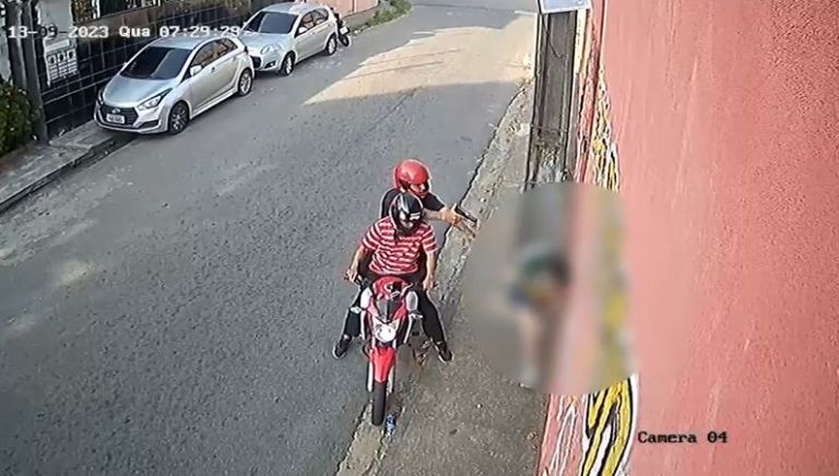 As imagens mostram que os criminoso estavam de capacete e anunciam o assalto. O garupa aponta uma arma para a cabeça da vítima que não entrega o celular e reage fugindo. A mulher parece gritar pedindo ajuda e é nesse momento que a dupla foge do local.