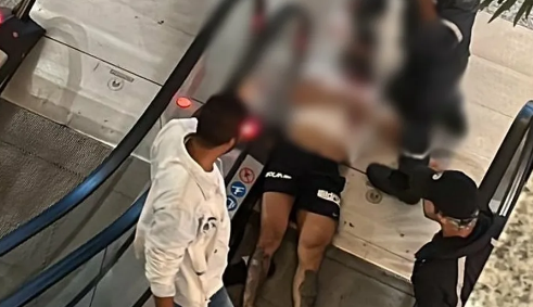 A vítima cumprimenta um dos suspeitos, que está de camisa vermelha, e, junto com os cúmplices, os quatro descem a escada rolante. Ainda na escada, a vítima é encurralada e outro homem, que está de blusa preta, saca a arma e dispara diversas vezes contra o jovem.
