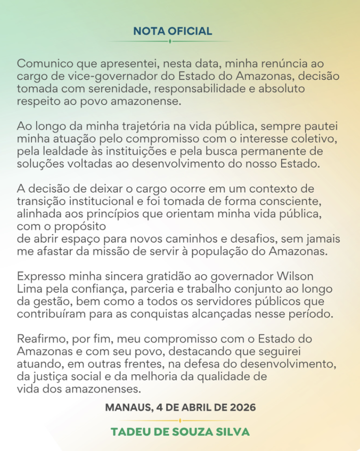 Em carta, Wilson Lima diz que deixou o cargo em caráter “irrevogável e irretratável”, citando o prazo de seis meses antes do pleito. Tadeu de Souza, também em carta, adotou o mesmo fundamento jurídico ao renunciar ao posto de vice-governador. Ambos devem ser candidatos nas eleições de outubro e tinha até este sábado para renunciar.